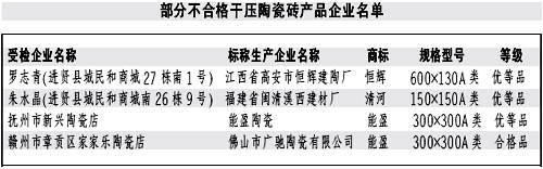 本報訊記者龔漢斌報道:近日,江西省質監(jiān)局公布了近期對干壓陶瓷磚產品進行省級產品質量監(jiān)督抽查的結果。質監(jiān)部門共抽查了51家生產企業(yè)生產的52批次產品,抽樣合格率90.4%。抽查結果表明,本次抽查的陶瓷磚其放射性核素限量指標均達到了標準規(guī)定的要求;但仍有部分產品存在一些問題。