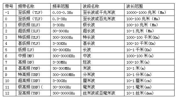 目前,根椐《中華人民共和國無線電頻率劃分規(guī)定》,我國已對9K~1000GHz頻帶內的無線電業(yè)務做出了規(guī)劃,對無線電頻帶和波段也做了命名(見表1)。